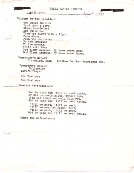The 60th Annual Gable Reunion was held on the Schlicher Farm in Corning. There were about 90 people in attendance on a hot and humid day. Greetings and opening remarks were made by President Ruby Reinik. Families were introduced according to the Family Tree.