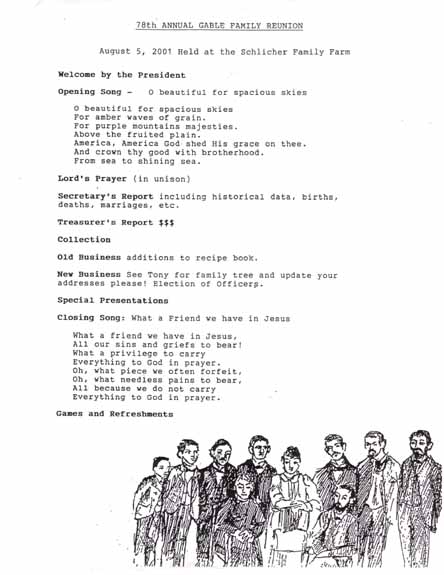 The 78th Annual Reunion was held August 5, 2001, at the farm of William and Florence Schlicher.